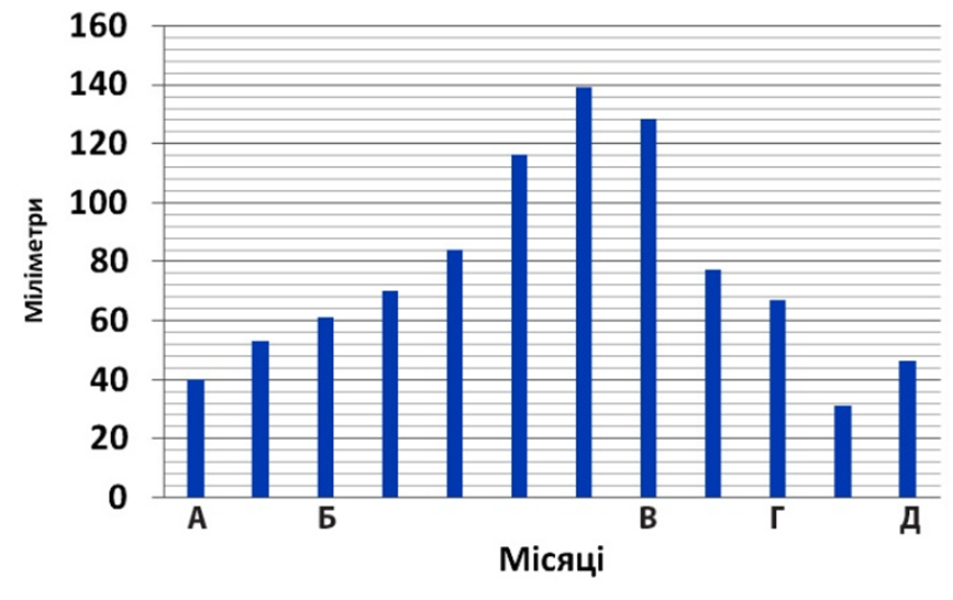 Укажи літеру, серед позначених на діаграмі опадів за рік, яка позначає місяць з більшою кількістю опадів