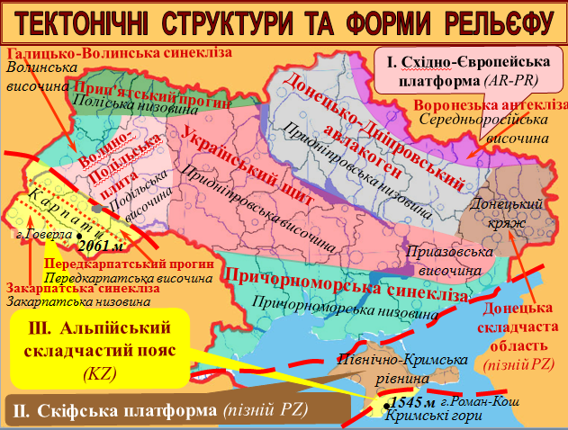 Проаналізуй карту тектонічних структур і форм рельєфу на території України.