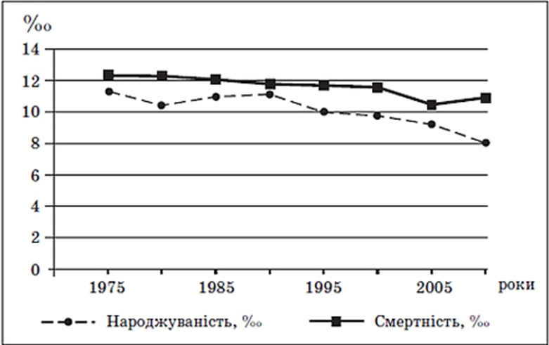 Проаналізуй графіки, що відображають демографічну ситуацію в одній із країн світу. Укажи наслідок такої динаміки демографічних показників у країні