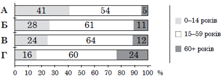 На діаграмах відображено віковий склад населення Європи, Азії, Африки й Латинської Америки. Укажи діаграму, характерну для Європи. Зверни увагу, що для Європи характерним є старіння населення