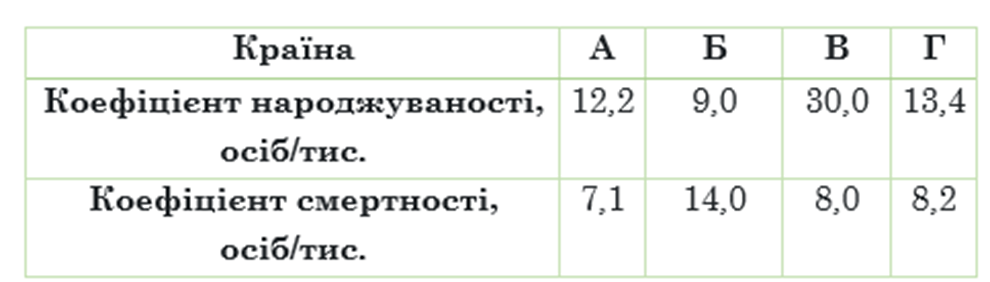 Проаналізуй наведені в таблиці коефіцієнти народжуваності й смертності окремих країн світу й укажи країну, у якій спостерігають явище депопуляції населення