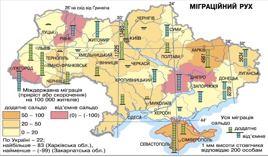 Розглянь картограму міграційного руху населення. УКажи область, що має найбільше скорочення кількості населення через від’ємне сальдо міждержавних міграцій