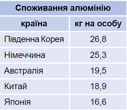 Розглянь таблицю країн-лідерів за сегментами глобального ланцюга доданої вартості в алюмінієвій промисловості (на 2017 р.). Увідповідни країни-лідери за споживанням алюмінію з місцями, які вони посідають