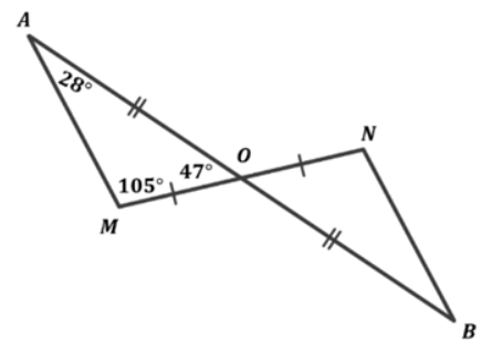 Відомо, що ∠AOM = 47°, ∠OMA = 105°, ∠MAO = 28°. Знайди кути трикутника NOB