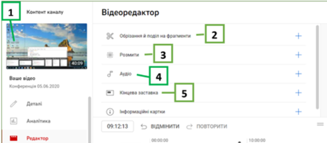 На малюнку зображене вікно відеоредактора YouTube-студії.