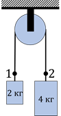 Вантажі з масами 2 кг і 4 кг з’єднані ниткою, перекинутою через блок. Увідповідніть припущення в умові задачі з наслідками цих припущень