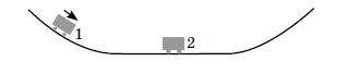 Маленький візок 1 скочується з гірки заввишки 54 см і на горизонтальній ділянці зчіплюється з нерухомим візком 2, маса якого вдвічі більша (див. рисунок). Визначте (у сантиметрах), на яку висоту піднімуться зчеплені візки. Опір руху не враховуйте.