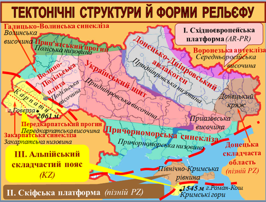Проаналізуйте карту тектонічних структур і форм рельєфу на території України.