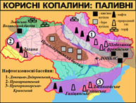Розгляньте карту поширення паливних корисних копалин на території України. Увідповідніть назви тектонічних структур із басейнами видобутку паливних ресурсів
