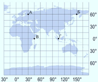 Визначте географічну довготу точки Г й укажіть правильну відповідь