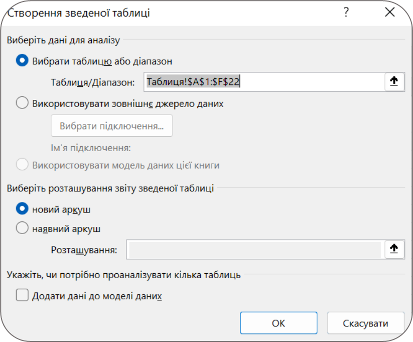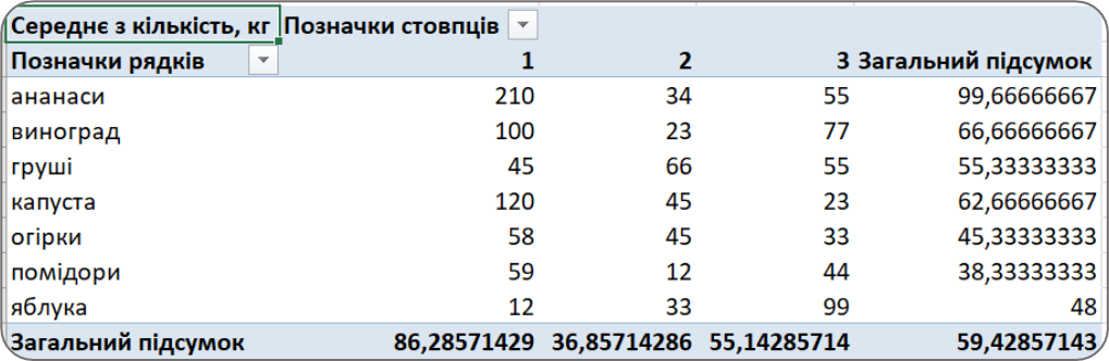 У цій вправі Ви створите зведену таблицю, що відображатиме сумарні кількості овочів кожного типу на кожному з трьох складів, а також середню кількість овочів одного типу на кожному з них.