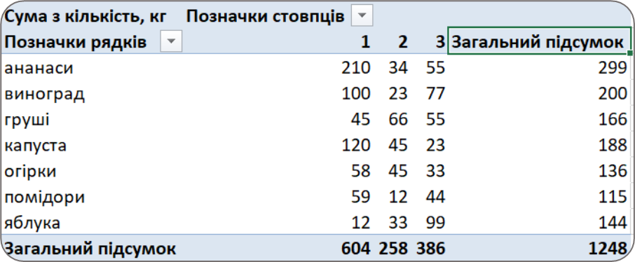 Дані щодо кількості овочів потрібно відображати як для кожного складу, так і для кожного товару. Тому поле «Назва товару» перетягніть в область рядків, а поле «Номер складу» — в область стовпців (рис. 2).