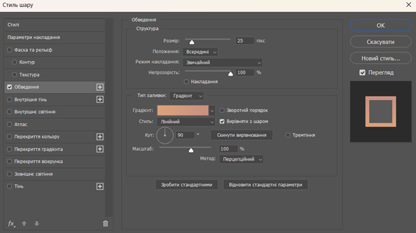 13. Правою кнопкою миші клацніть: по Шару 1 → Параметри накладення → Обведення → положення Всередині → вибрати Розмір і Колір обведення (рис. 2).