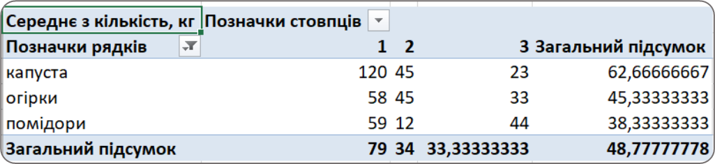 У цій вправі Ви створите зведену таблицю, що відображатиме сумарні кількості овочів кожного типу на кожному з трьох складів, а також середню кількість овочів одного типу на кожному з них.