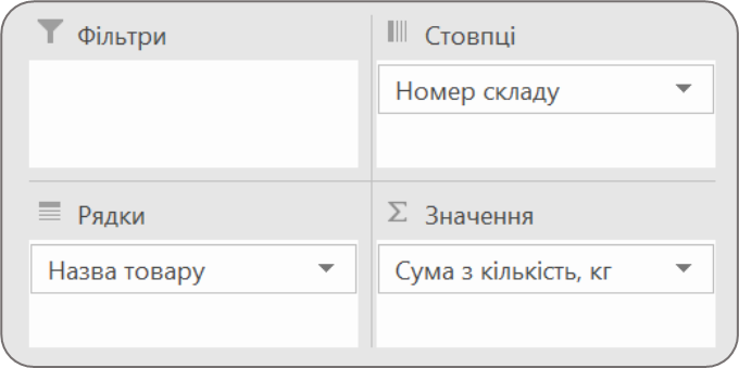 Дані щодо кількості овочів потрібно відображати як для кожного складу, так і для кожного товару. Тому поле «Назва товару» перетягніть в область рядків, а поле «Номер складу» — в область стовпців (рис. 2).