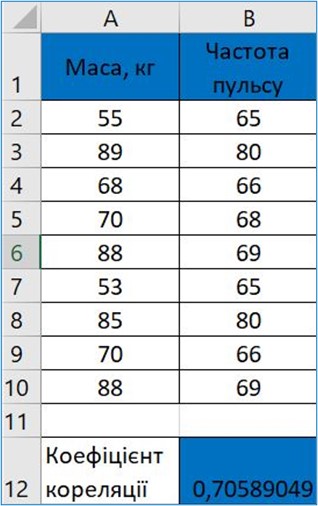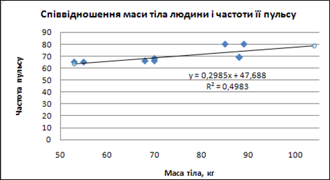 Проведено статистичне спостереження за дев’ятьма респондентами, у кожного з яких виміряно масу тіла і частоту пульсу. Потрібно встановити, чи існує взаємозв’язок між цими параметрами, а також спрогнозувати, яким найімовірніше буде пульс у людини, маса тіла якої становить 100 кг.