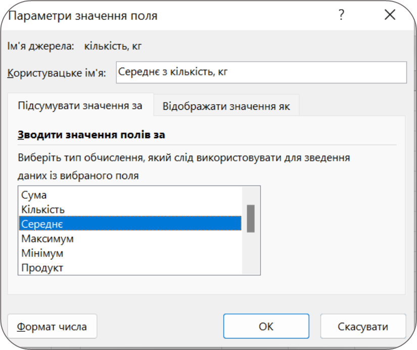 У цій вправі Ви створите зведену таблицю, що відображатиме сумарні кількості овочів кожного типу на кожному з трьох складів, а також середню кількість овочів одного типу на кожному з них.