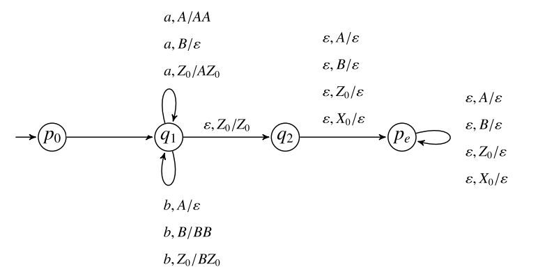 Na slici je zadan potisni automat koji prihvata riječi praznim stack-om sa jednim nedostajućim prijelazom.