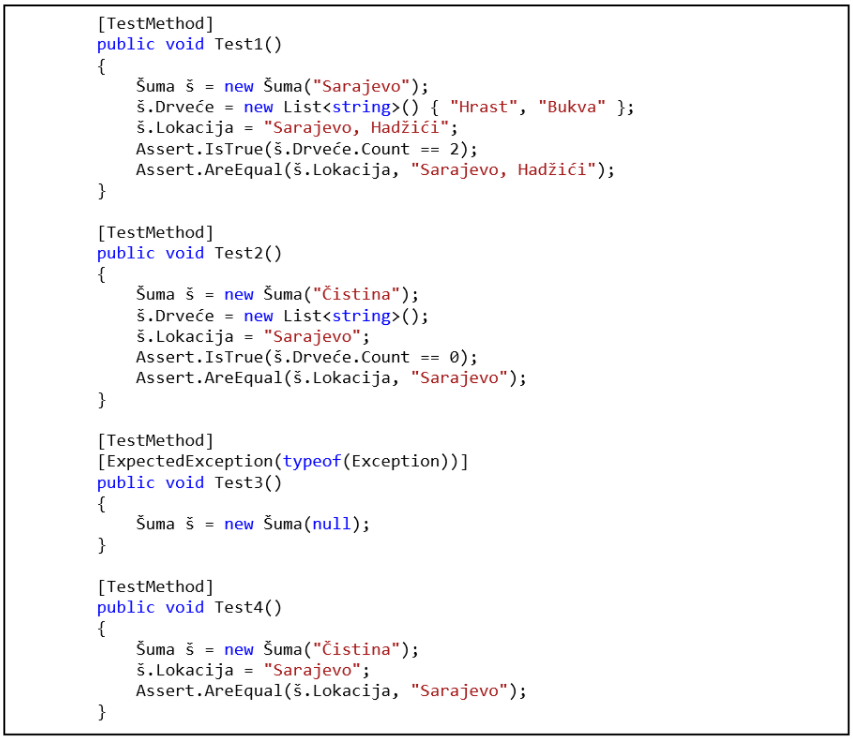 Za programski kod prikazan ispod definisana su četiri unit testa.