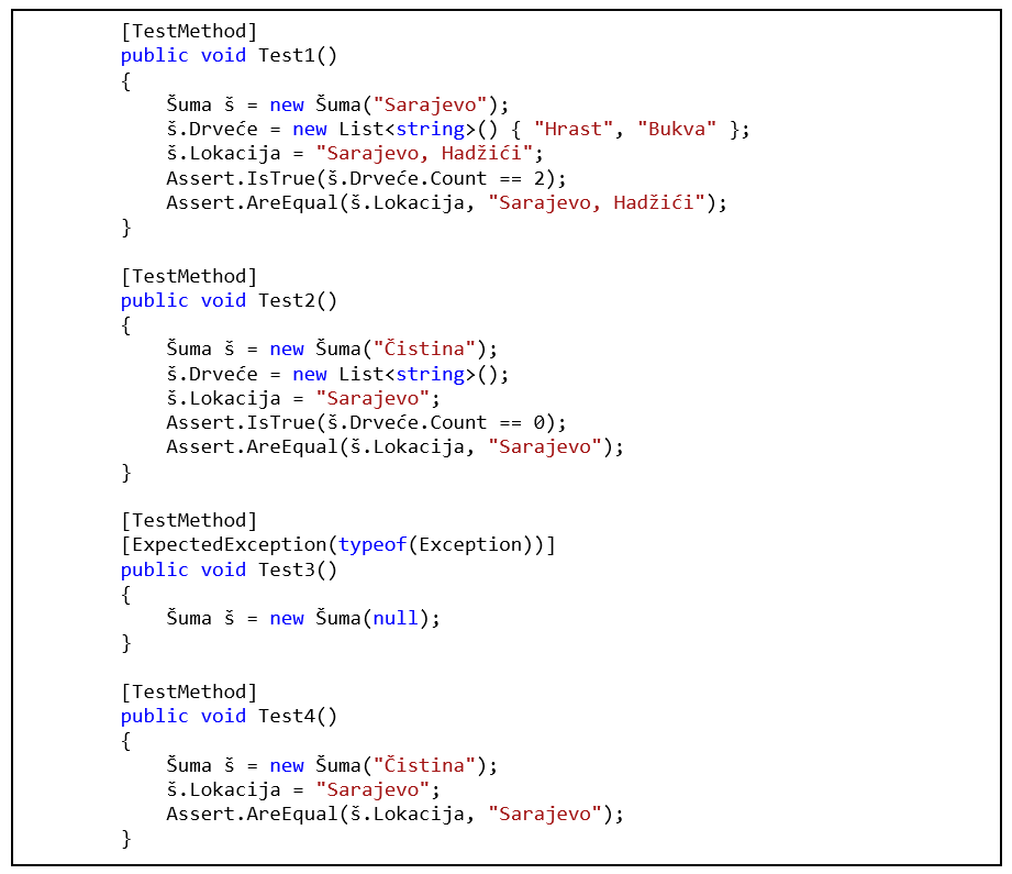 Za programski kod prikazan ispod definisana su četiri unit testa.