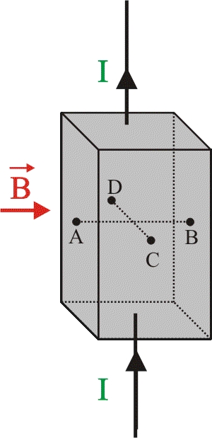 Un prisma rectangular metálico de Cu está recorrido por una corriente estacionaria de intensidad . Se aplica un campo magnético uniforme perpendicularmente a una de sus caras, tal como se indica en la figura. Si antes de aplicar el campo , ¿qué se puede decir respecto a la situación final?.