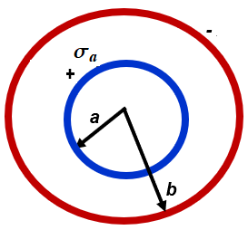 Considerar dos cortezas esféricas concentricas, la interior de radio , con una distribución de carga uniforme por unidad de superfice y la exterior de radio , con una distribución de carga uniforme por unidad de superficie negativa, tal que la el modulo de la carga total sobre ambas cortezas sea la misma Determinar la densidad de carga de la corteza exterior. Expresar la medida en nano unidades del S.I. con cuatro decimales.