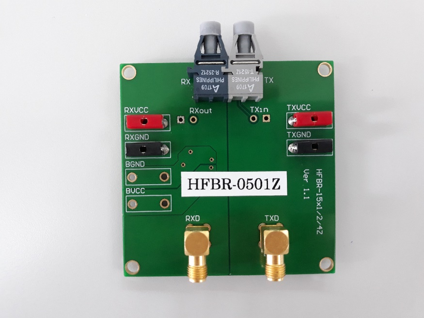 En aquesta pràctica utilitzarem el kit de Avago en el que trobem junts en una sola placa el circuit que s’encarrega de la transmissió TX per fibra òptica HFBR-1521Z (part dreta de la placa) i el circuit que s’encarrega de la recepció RX HFBR-2521Z (part esquerra de la placa), que veurem amb més detall en els subapartats següents. Podem considerar que són dos sistemes pràcticament simètrics, un al costat de l’altre.