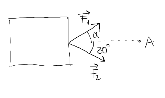 Suposa les dues forces aplicades sobre el cos tal i com s'indica  a la figura. Inicialment el cos es troba en repòs Sabent que el modul de \vec{F_1}\vec{F_1} és F_1F_1 i que el mòdul de \vec{F_2}\vec{F_2} és F_2=FF_2=F (valor conegut). Quin ha de ser el mòdul de F_1F_1 per talque el cos es desplaci cap a A en funció de FF i \alpha\alpha?