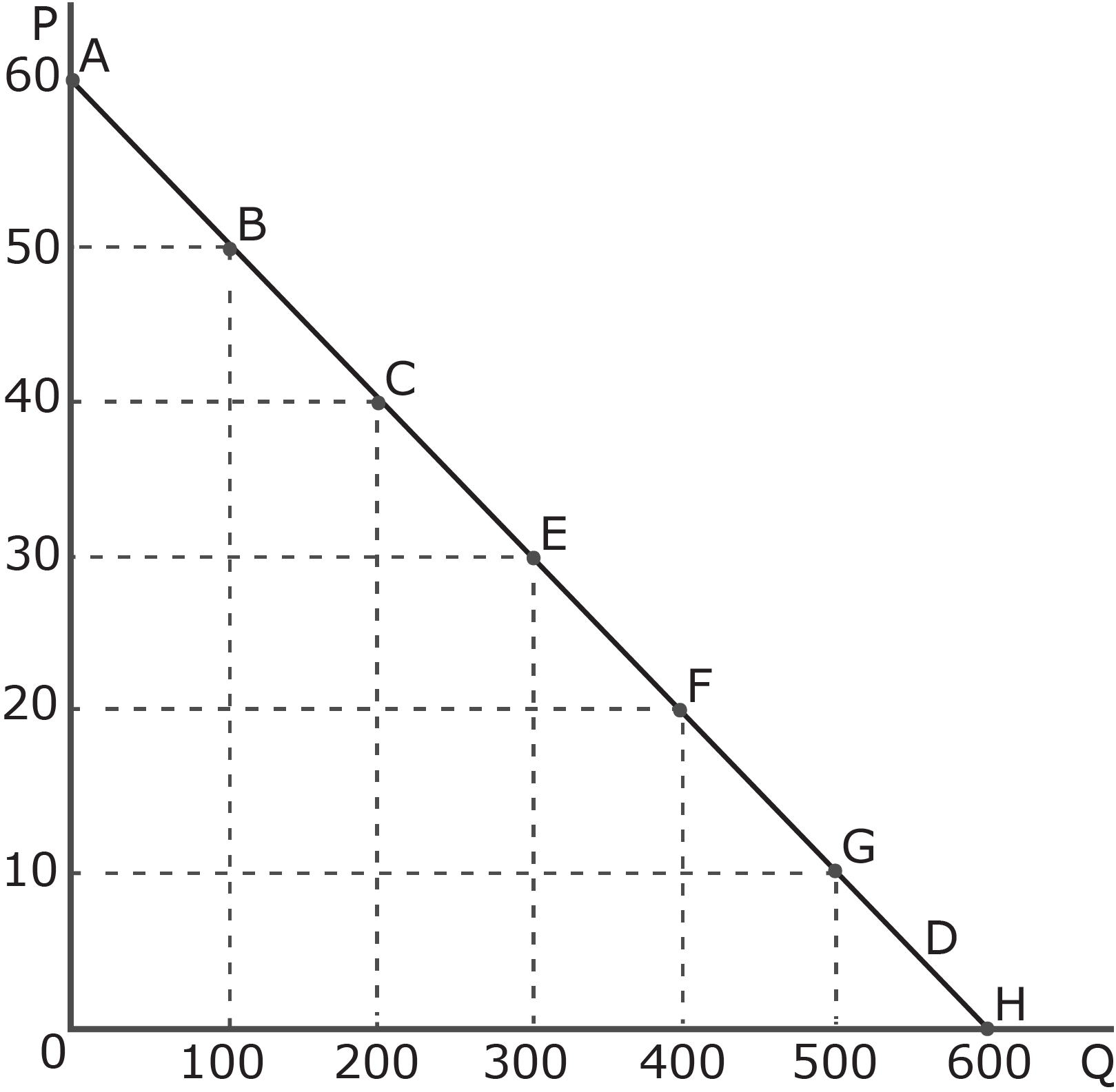 Using the formula for arc elasticity, what is the price elasticity of demand for the segment FG? (Ignore the negative sign and round off to 2 decimal places.)