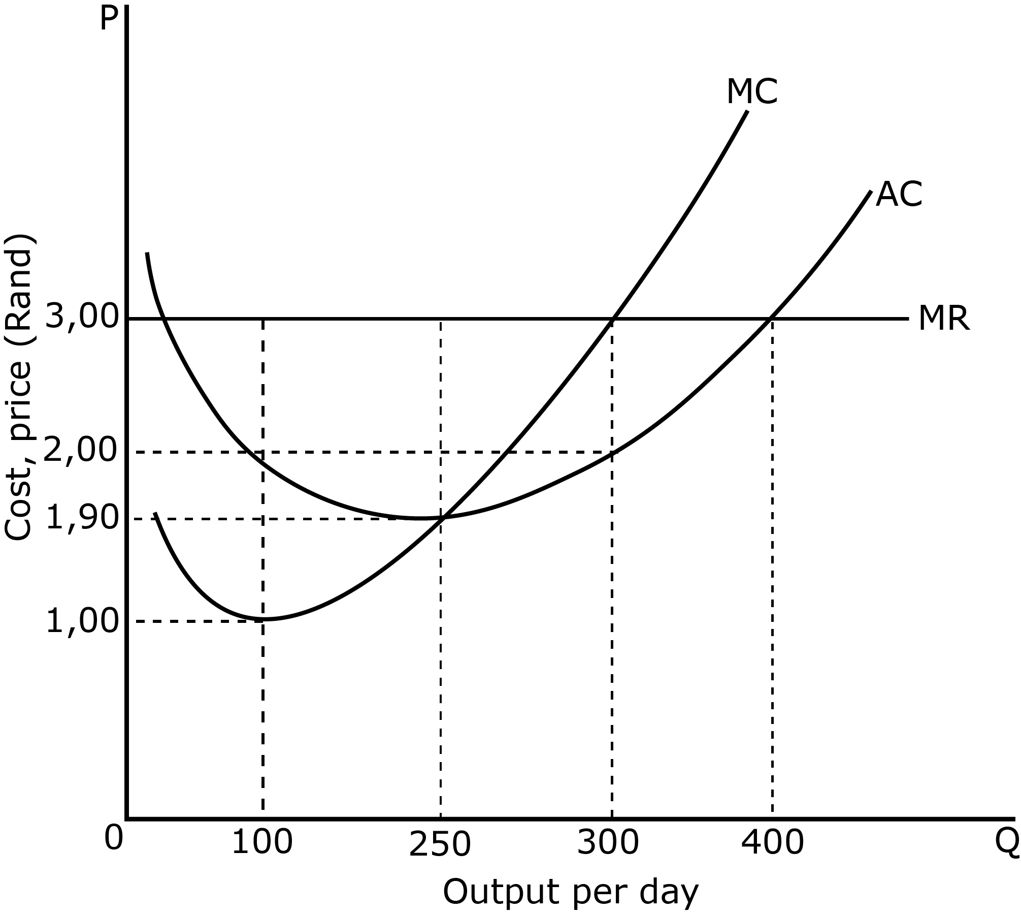 Taki hopes to become a dentist one day. In the meantime, like many of his friends, he is selling sweets at the local taxi rank. The following diagram shows his cost and revenue curves.