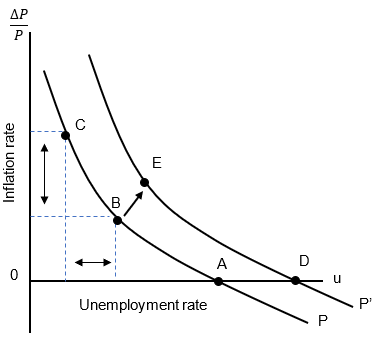 Which of the following factors will result in a rightward shift of the Phillips curve as illustrated?