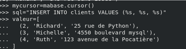 La série d'instructions suivante insère trois enregistrements dans la table clients