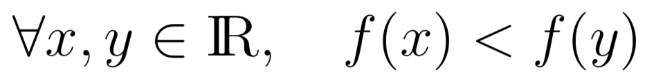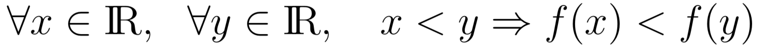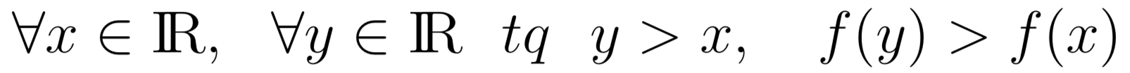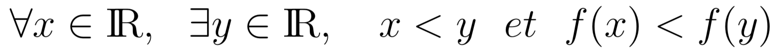 Avec des quantificateurs, l'affirmation "f est strictement croissante sur " s'exprime par :
