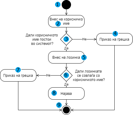 Внесете ја точната секвенца од извршување на акциите во рамки на дијаграмот на активности прикажан на сликата при извршување на следното корисничко сценарио: „Корисникот внесува корисничко име и точна лозинка“.