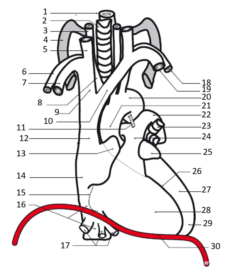Donner le nom des structures fléchées sur la vue antérieure du coeur :