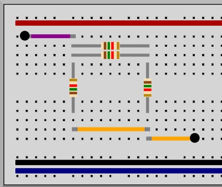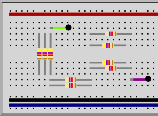 Sa se determine rezistenta echivalenta intre capetele marcate cu bulina neagra ale celor doua fire de conectare.