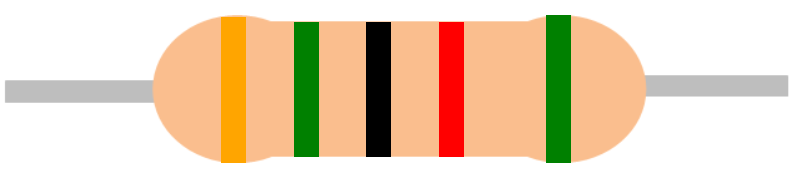 Codul culorilor este reprezentat pe 5 benzi. Banda de toleranță este in dreapta.