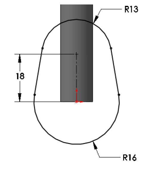 Schița din imagine reprezintă un profil utilizat pentru generarea unei piese printr-o operație de tip Extrude. Care dintre afirmațiile de mai jos descrie corect constrângerile geometrice și dimensionale aplicate schiței?