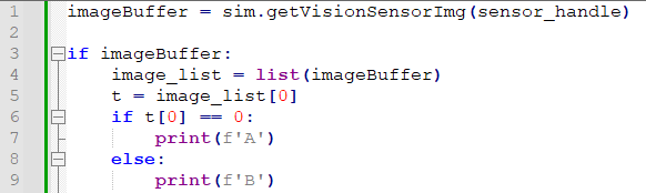 În urma rulării segmentului de cod de mai sus, dintr-o scenă CoppeliaSim în care este utilizat un senzor vizual și un obiect, în consola CoppeliaSim s-a printat litera 'B'. În acest caz: