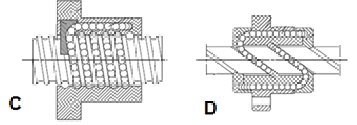 Pentru solutiile de surub - piulita cu bile din cele doua figuri, in corespondenta cu litera din fata fiecarei figuri, precizati ce tip de sistem de pretensionare este folosit la toate variantele de suruburi cu bile din imaginea A si respectiv ce tip de sistem de pretensionare este folosit la toate variantele de suruburi cu bile din imaginea B: