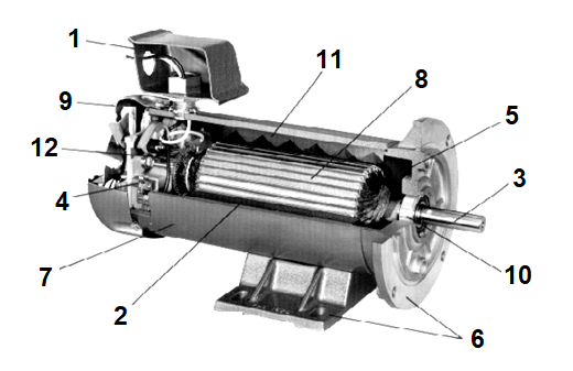 Utilizand notatiile numerice din figura de mai jos, selectati dintre raspunsurile posibile denumirile corecte ale elementelor componente ale motorului de c.c. reprezentat in figura.