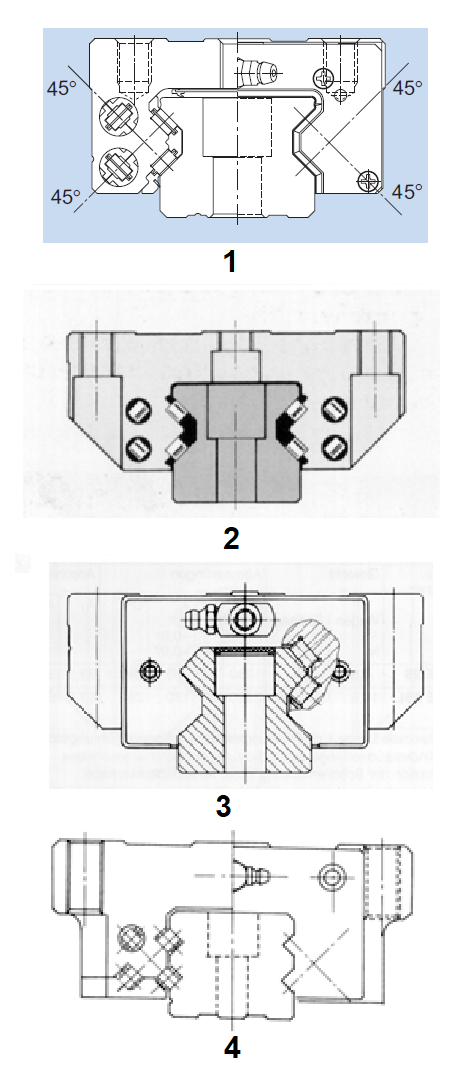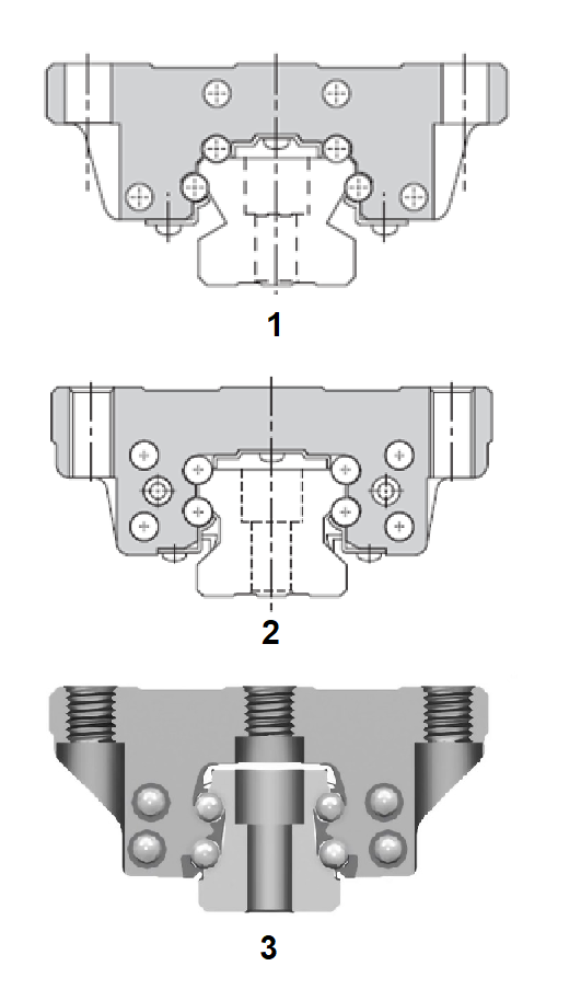 8. Pentru ghidajele care nu au capacitati portante egale pe toate directiile de incarcare, care este raportul dintre capacitatea de incarcare cea mai mare si capacitatea de incarcare medie8.1. 0.5008.2. 0.7078.3. 0.8669. Pentru ghidajele care nu au capacitati portante egale pe toate directiile de incarcare, care este raportul dintre capacitatea de incarcare cea mai mare si capacitatea de incarcare minima9.1. 0.5009.2. 0.7079.3. 0.866Pentru montajul ghidajelor de tip tanchete cu bile prezentate in figurile de mai jos precizati: