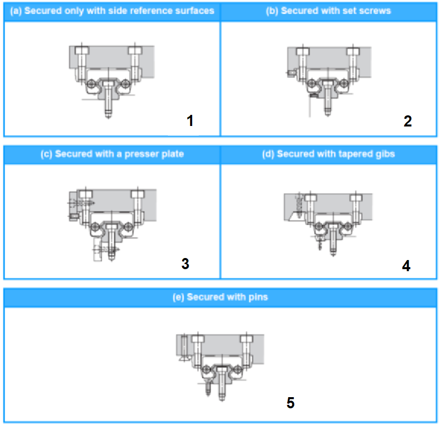 2. In fig. 2 sunt prezentate mai multe solutii de fixare a ghidajelor de tip tanchete cu bile. In corespondenta cu numarul de ordine indicat langa fiecare figura specificati: