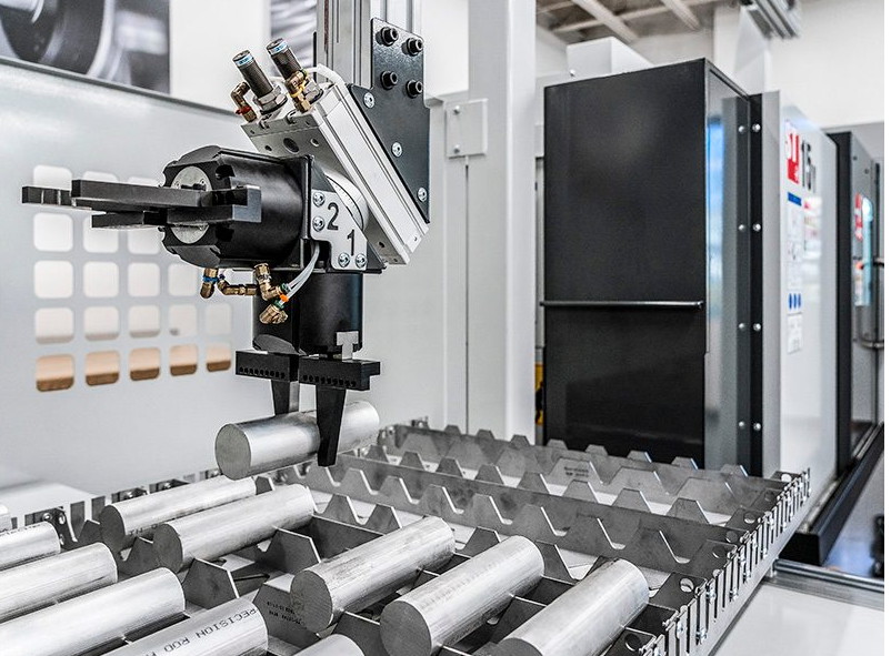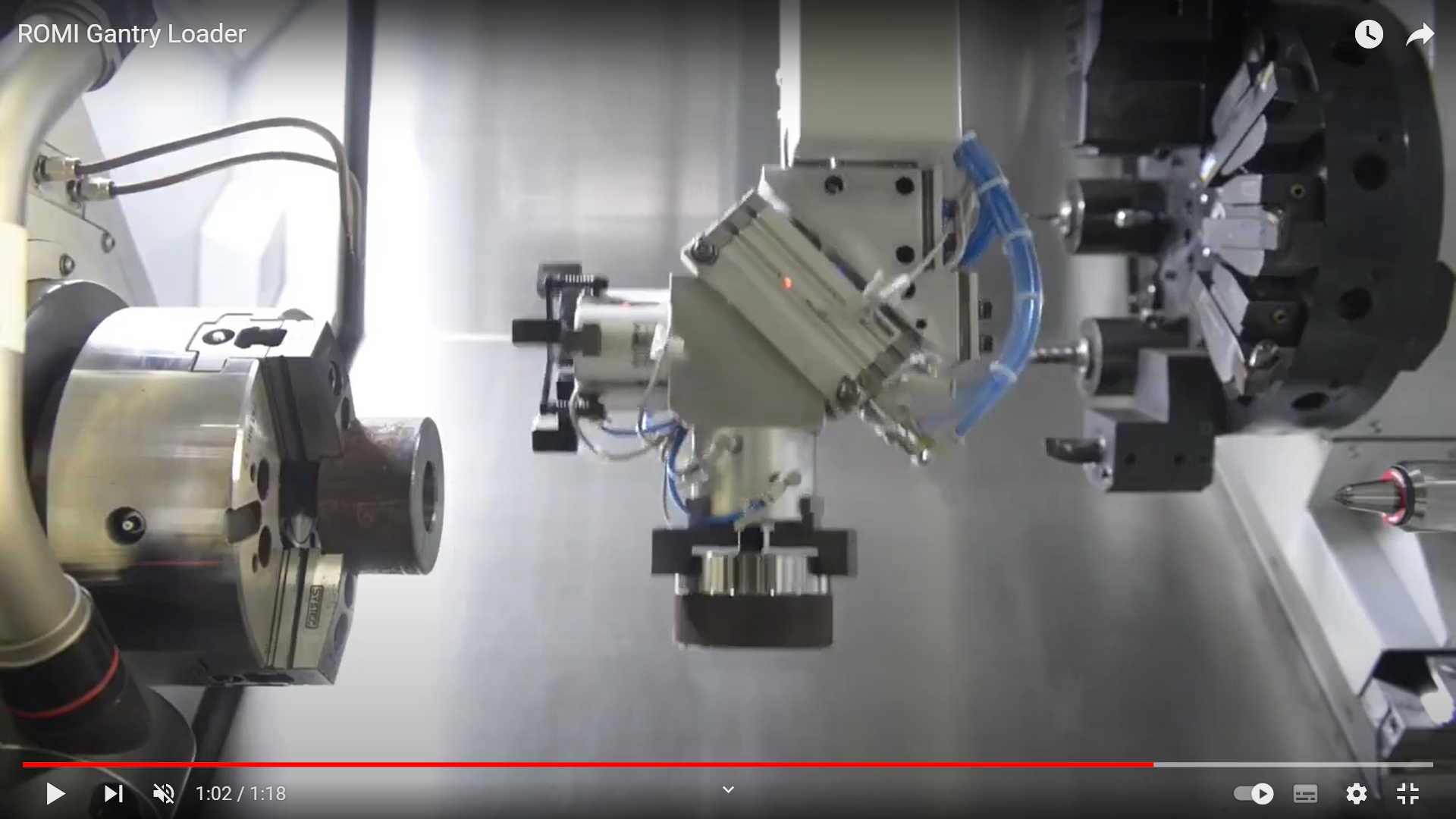 b2 un RI cu o culisa echipat cu un efector dublu, cu rotire de schimbare a reperelor in afara spatiului de lucru al masinii