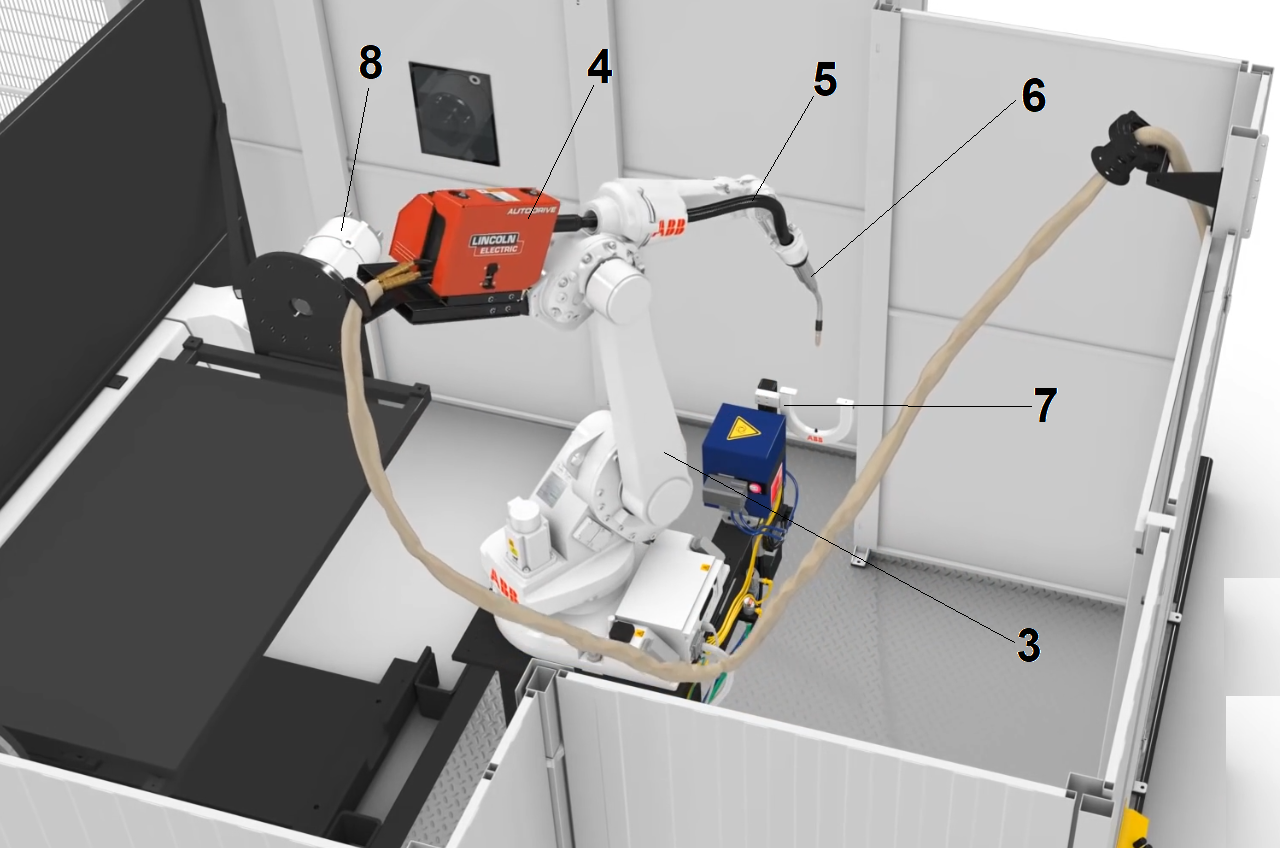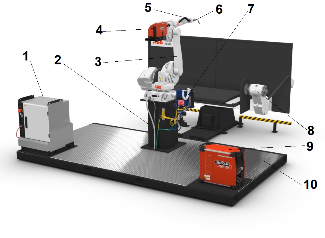 Cu referire la conceptul sistemic unitar de "RI intergrat in mediul tehnologic" si avand in vederede numerele de ordine cu care sunt marcate unele dintre elementele componente ale unei celule de sudare robotizata cu arc electric din figurile de mai jos (in ambele figuri pentru acelasi component numerotarea fiind identica) , precizati: