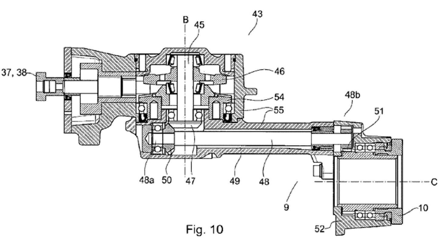 e. Care dintre cele doua roti conice conduse 46, 54 apare in reprezentarea grafica 2D de tip sectiune din dreapta imaginii de tip perspectiva a unitatii de sistem de orientare? (Indicatie: pentru identificarea raspunsului corect, in formularea acestuia corelati imaginea din sectiunea indicata cu cea din sectiunea complementara prezentata in figura 10)