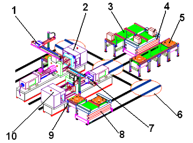 Pentru sistemul de fabricatie robotizata prezentat in figura de mai jos precizati denumirea subsistemelor componente in acord cu numerotarea acestora din figura.