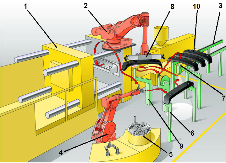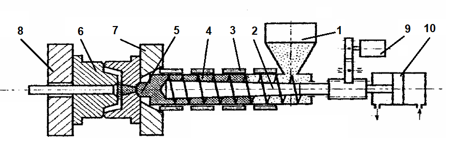 Utilizand notatiile din figura de mai jos in care se prezinta principiul de functionare a unei masini de injectie mase plastice in matrita selectati alocarea corecta a denumirii elementelor componente in raport cu numerotarea acestora.