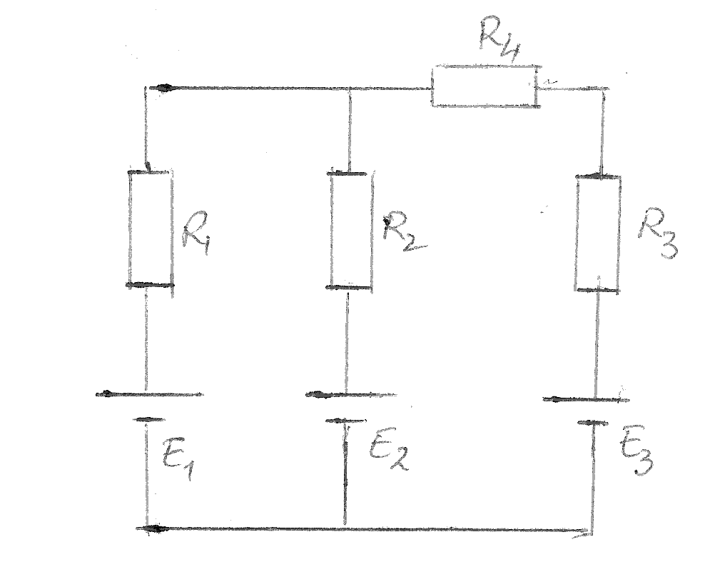 Pentru circuitul electric din figura de mai jos se cunosc t.e.m. ale surselor ideale, E1=6V, E2=10V si E3=20V si valorile rezistentelor R1=9.7Ω, R2=8Ω, R3=1.7Ω si R4=7.8Ω. Determinati valoarea intensitatii curentului electric prin rezistenta R4.