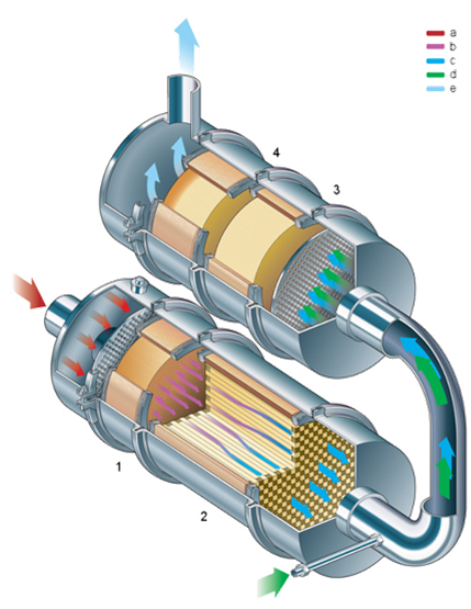De regulă, un M.A.C. care satisface limitările de emisii de noxe impuse prin regulamentul EURO 6 are incluse în traseul de evacuare a gazelor arse: